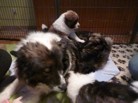 Auch mit fast 6 Wochen bekommen die Welpen mehrmals täglich noch ihren Nachtisch (Espresso) von Mama Bella und sie bleibt geduldig stehen, kümmert sich um die "Häufchen" und die Erziehung.